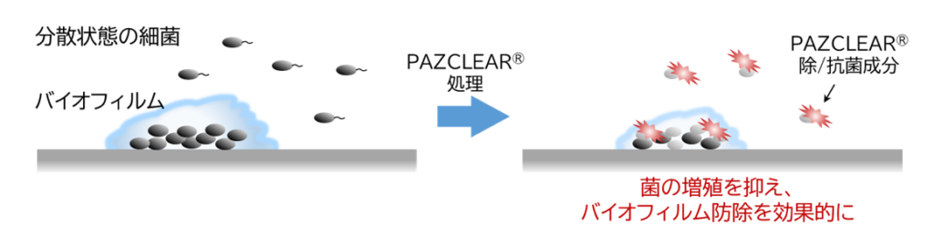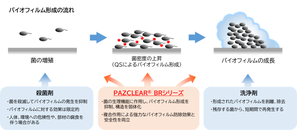 抗バイオフィルム剤『PAZCLEAR®』BRシリーズは、菌の生理状態を制御する特徴的な作用をもつ製品です。