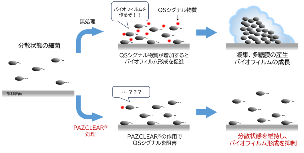 PAZCLEAR® BRシリーズは、細菌の生理機能に作用してQSを阻害することで、バイオフィルムの形成を防ぐとともに、構造を弱体化させます(非殺菌的作用)。